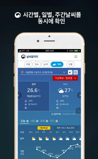 기상청에서 직접 제공하는 기상청 날씨알리미는 지진, 기상특보 등의 위험기상정보를 사용자 위치기반으로 알려주는 맞춤형 알림서비스입니다. 앱 실행 시 내 위치의 날씨상황을 한 눈에 볼 수